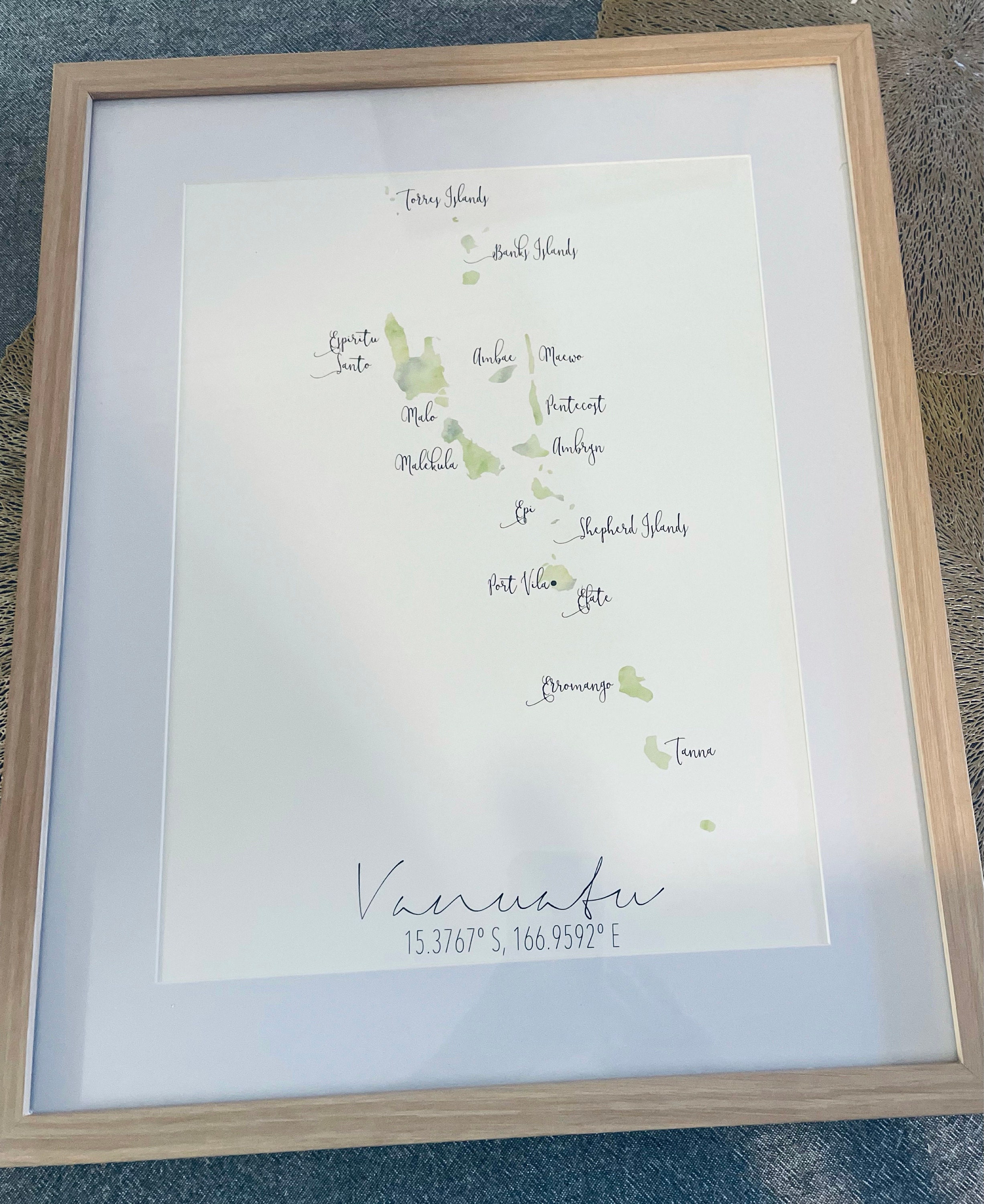 DESCRIPTION // A portrait, watercolour map of Vanuatu. Available in 8 different styles and either as a digital file or a physical print that is shipped to you.